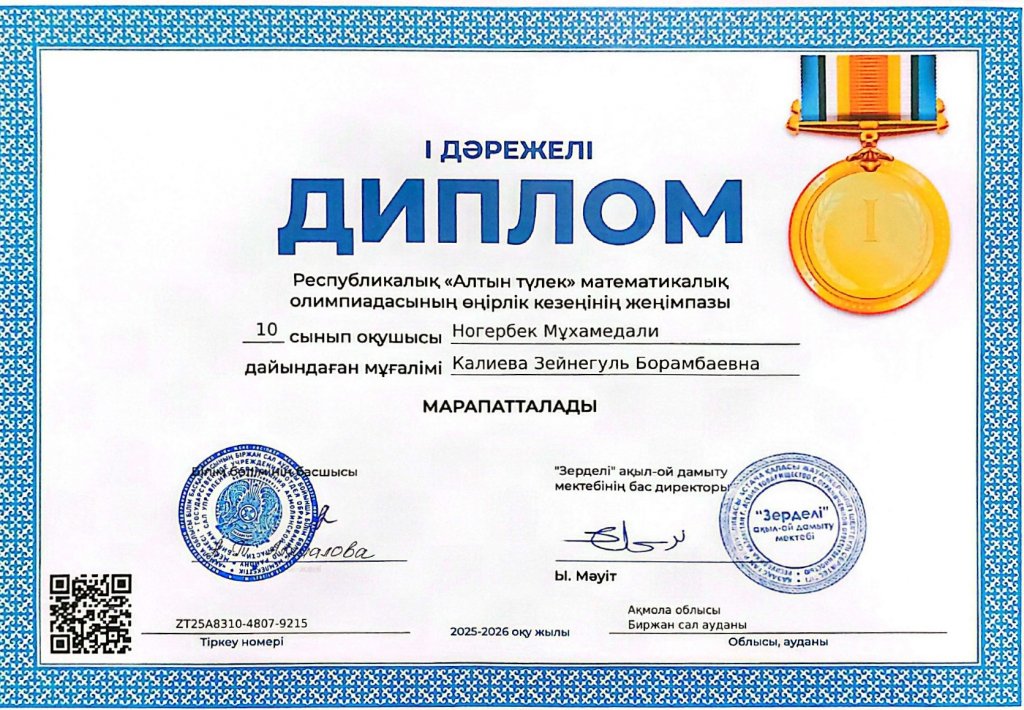 10-сынып оқушысы Ногербек Мұхамедали республикалық «Алтын түлек» математикалық олимпиадасының өңірлік кезеңінде жеңімпаз атанды.